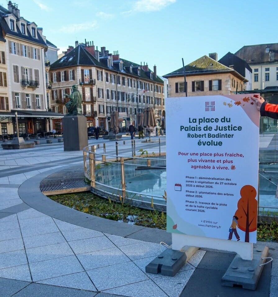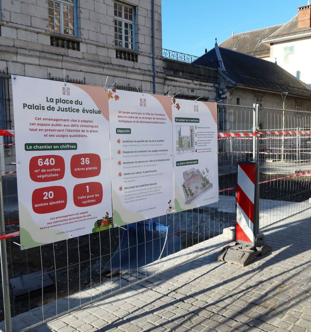 Dans le cadre du réaménagement et de la végétalisation de certains espaces de la place du Palais de Justice de Chambéry, j’ai réalisé 4 panneaux d’information pour informer les riverains des travaux : objectifs, contexte, calendrier. Ce panneau ci-contre a été apposé à deux endroits stratégiques de la place pour donner les informations principales du chantier.